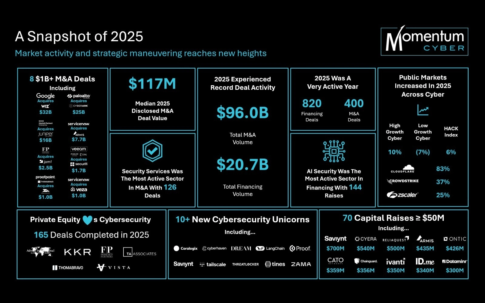 - Healthy Pipeline Ahead: Strong venture capital funding, robust strategic buyer interest, and continued cyber resilience investment signal a healthy pipeline of scaling opportunities.